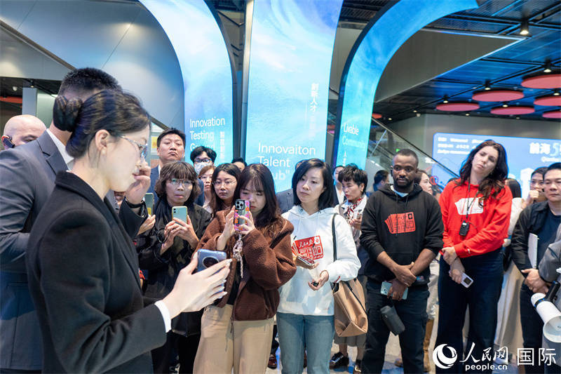 记者团在前海5号楼参观科技创新产品的展示并听取讲解。人民网记者 许峥摄
